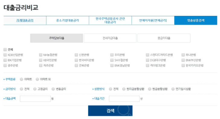 특히 은행연합회에서는 적격대출, 전세자금대출, 보금자리론, 디딤돌대출 등 한국주택금융공사 관련 대출금리도 각 은행별로 한번에 비교 확인할 수 있습니다.