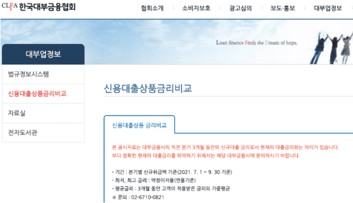 네번째 방법은 정부에서 승인 받은 대부업체 금리 비교는 한국대부금융협회에서 각 대부금융사의 3개월 동안의 신규대출 금리를 한번에 비교할 수 있습니다.