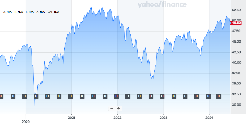 업종별로는 금융주가 16.9%로 가장 높은 비중을 보이고 있고, 그 다음으로 산업재 13.5%, 헬스케어 12.4%, 필수소비재 10% 등의 순서예요. 기술주 비중이 10.9%로 그리 높지 않은 편이에요(!!)